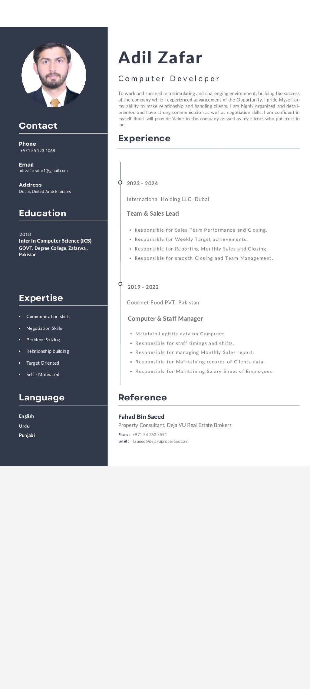 Lookin for job computer operator, assistant Accountant, sales executive, admin assistant any relevant field I've good command on computer and well experience of UAE CV attached for your reference. contact me