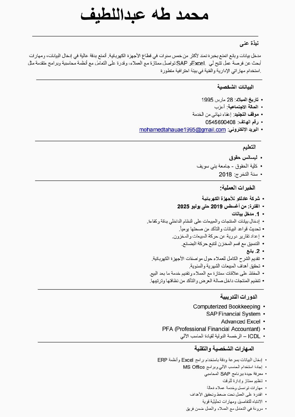 أنا محمد طه مصري الجنسية مقيم في دبي خريج كلية الحقوق أجيد استخدام الحاسب الآلي وأل word. وexcel كنت اعمل مدخل بيانات في معرض اجهزة كهربائية لمدة 7 سنين وأجيد اللغة الانجليزية بنسبة جيده. ابحث عن عمل في ادخال البيانات على الحاسب الالى ولدى قابلية على التكييف والتعلم بسرعة في بيئة العمل