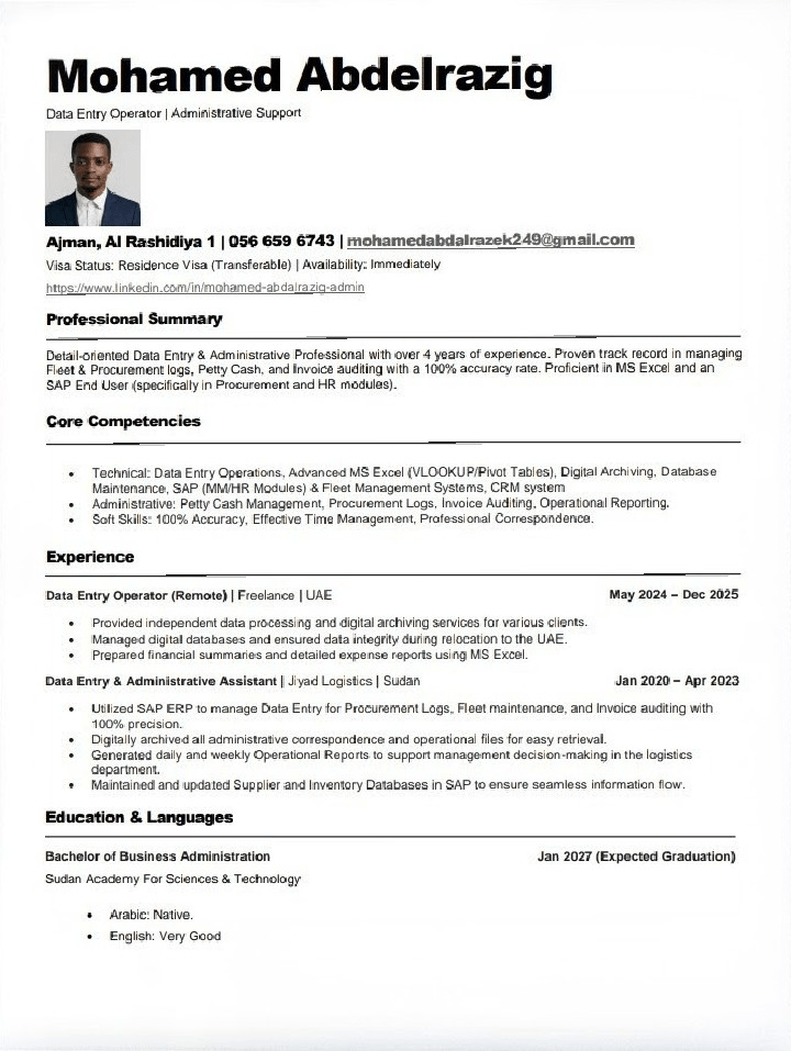 Data Entry Operator with over 4 years of experience, looking for a good work opportunity, Arabic/ English, Ajman, Rashidiya 1