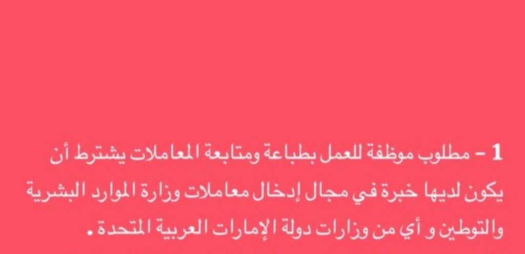 1 - A female employee is required to work in printing and following up on transactions. She must have experience in entering transactions for the Ministry of Human Resources and Emiratization and any of the ministries of the United Arab Emirates. Contact via WhatsApp only