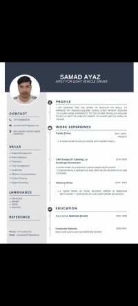اسمي صمد أياز من باكستان. لدي رخصة قيادة مركبة خفيفة صادرة من أبوظبي بتاريخ 23. 102014. لدي خبرة عمل 11 عاما في الامارات العربية المتحدة. عملت كسائق خاص لمدة 4 سنوات، و4 سنوات في مطعم مار وش، وسنة واحدة كسائق توصيل و3 سنوات في توصيل واستلام الطلبات في مجموعة UNF. لدي معرفة جيدة بجميع طرق الامارات العربية المتحدة ومواقعها. اذا كان لديكم أي وظيفة شاغرة سائق خاص أو في أي شركة، فأرجو منحي فرصة شكرا