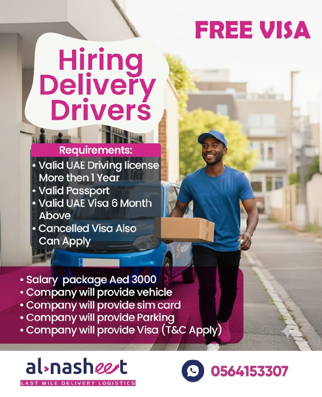 Valid Own visa should be 6 months. Original Passport while coming to an interview Valid UAE Manual license - more than 1 year. Salary AED3000. The company will provide a vehicle The Company will provide Fuel. The company will provide a sim card. The company will provide parking (Only working hours)