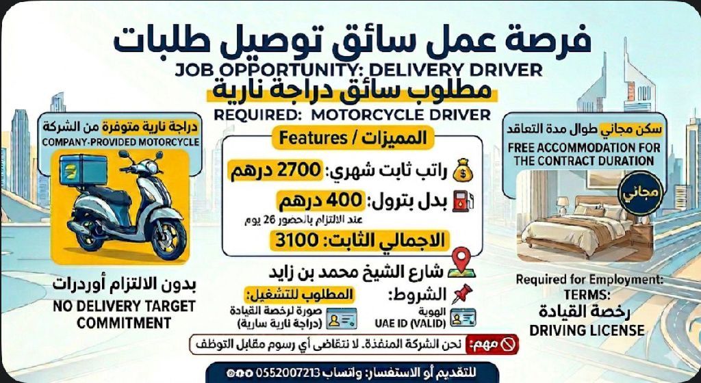 معاك رخصة موتوسيكل سارية وإقامة سارية جاهز تشتغل فورا وبراتب ثابت 3100 درهم نوفر لك عمل سائق طلبات مع شركة من أكبر شركات توصيل الطلبات + سكن بدون مجاني + توفير دراجة بخارية + وجبة رئيسية يومية استلام العمل في نفس اليوم بدون أي رسوم أو عمولات (أحنا الشركة المنفذة مباشرة) العنوان دبي شارع الشيخ محمد بن زايد تواصل معنا الآن لمعرفة كل التفاصيل