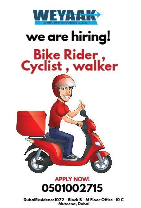 Hiring Bike Riders Location Rashed Alkalbany Building, M6, Deira, Dubai Basic Salary AED4200 Visa Provided + Bonus Contact Call us