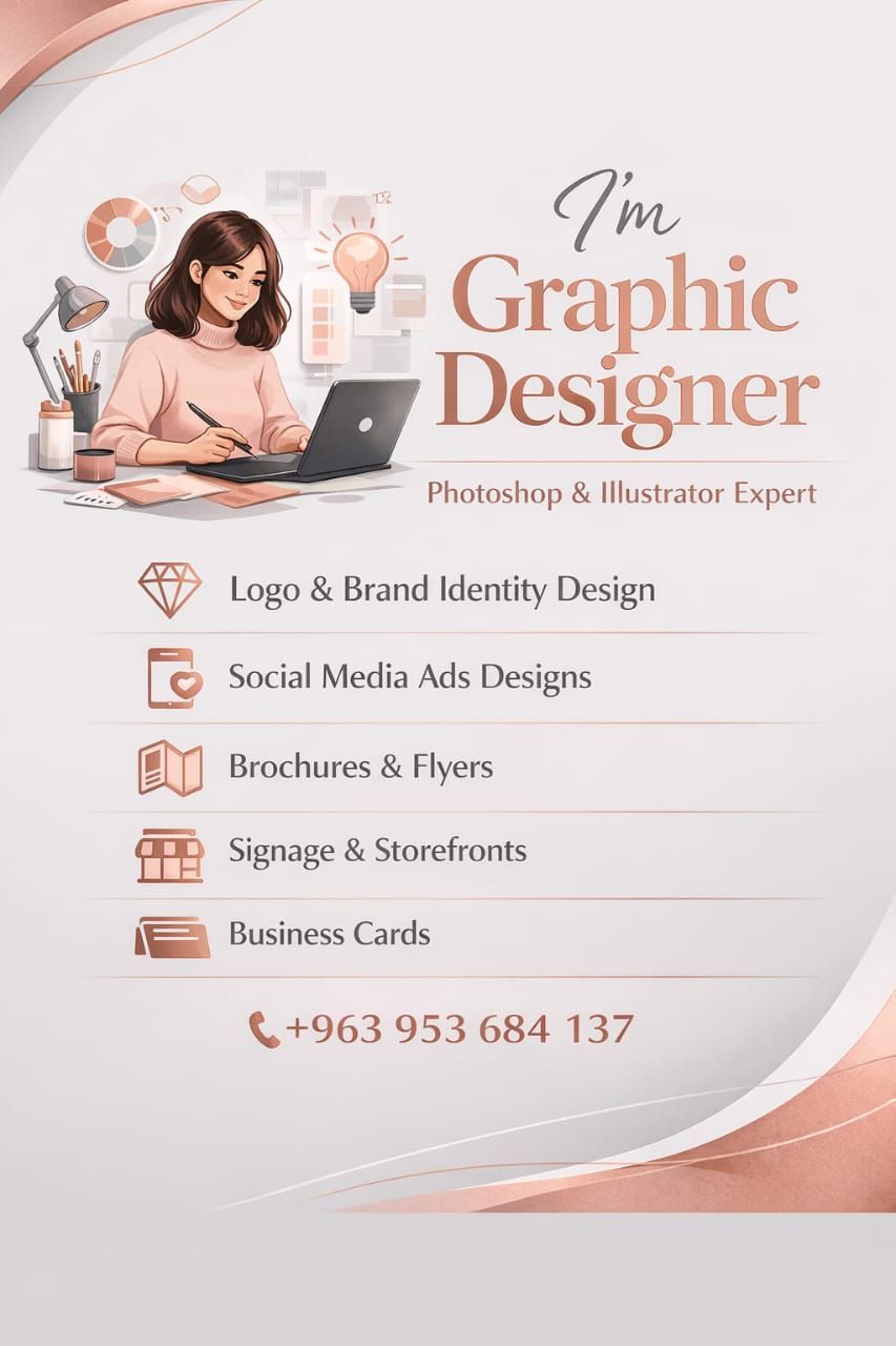 تصميم غرافيك يشمل تصميم اللوغو والهوية البصرية، تصميم اعلانات وسائل التواصل الاجتماعي، البروشورات، اللافتات والواجهات، بطاقات العمل، خبرة كبيرة وأسعار مدروسة وقابلة للتفاوض، وامكانية التعديل حتى الحصول على نتيجة مرضية للعميل