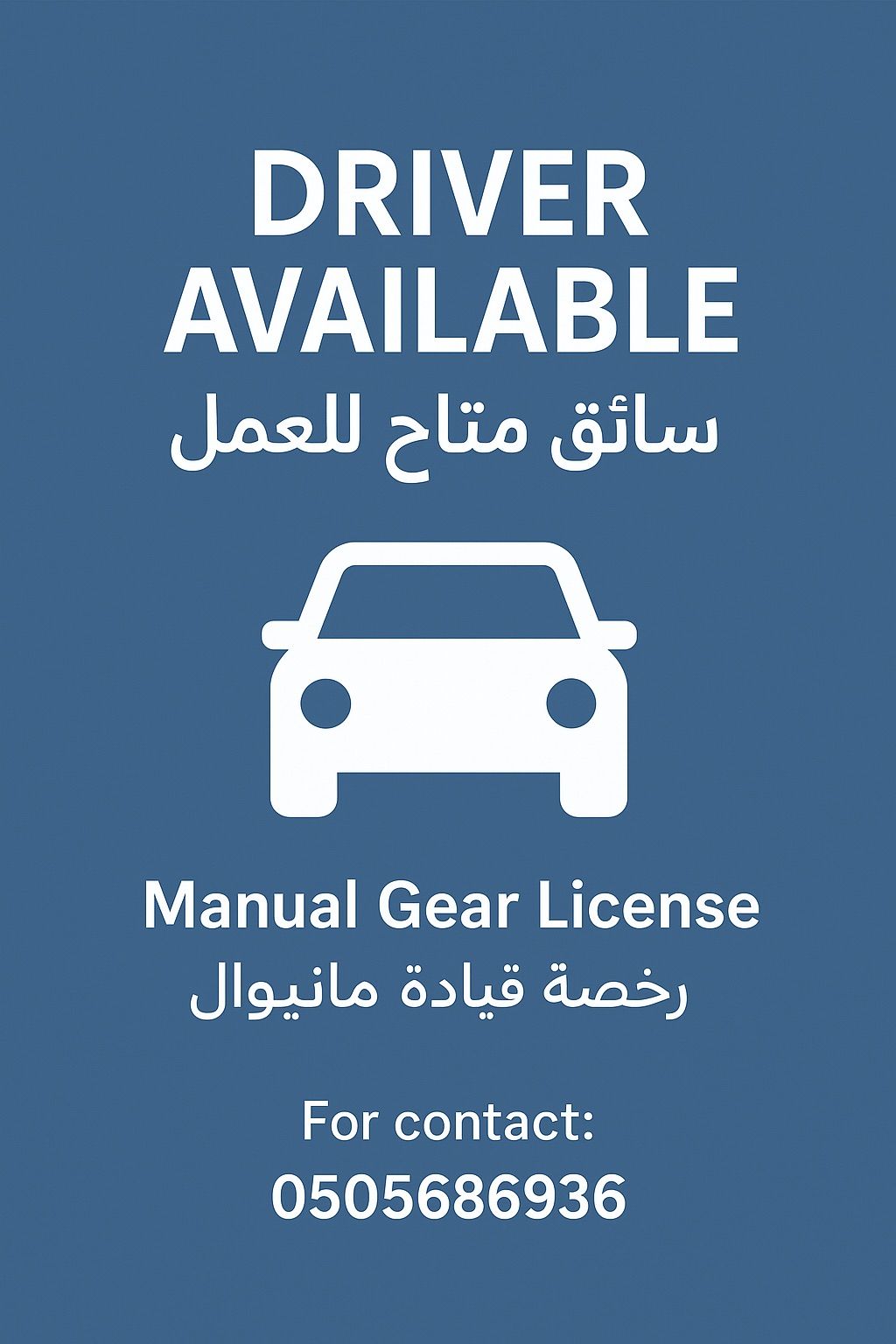 سائق حاصل على رخصة قيادة مهنية (جير مانيوال) سارية داخل دولة الامارات ملتزم بالمواعيد وحسن المظهر. أتقن اللغتين العربية والانجليزية وأجيد التعامل باحترافية مع العملاء. مستعد للعمل فورا أفضل العمل في الفترة المسائيه لكني مرن حسب الحاجة (دبي)