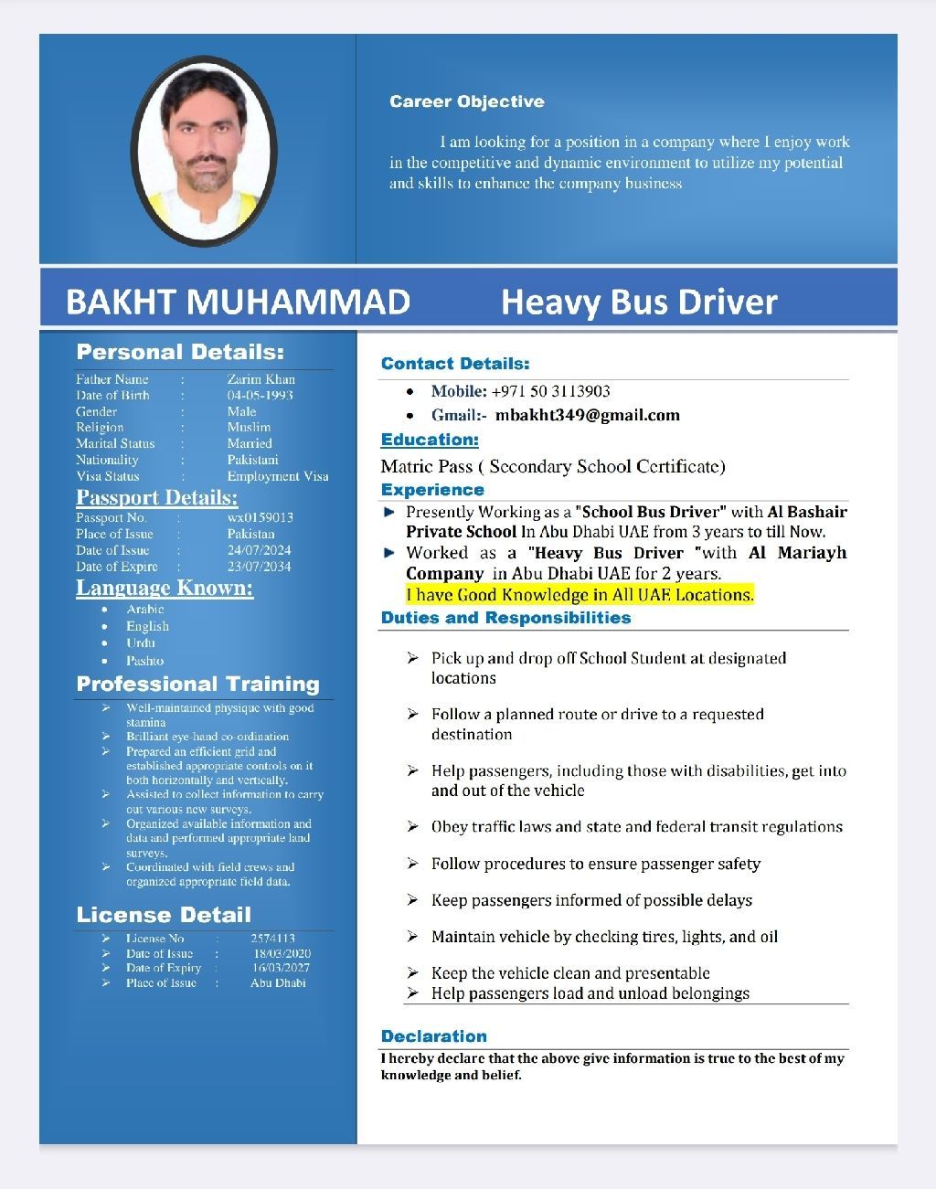 My name is Bakht Muhammad I am living in Abu Dhabi I have experience 6 year as bus driver all over UAE locations