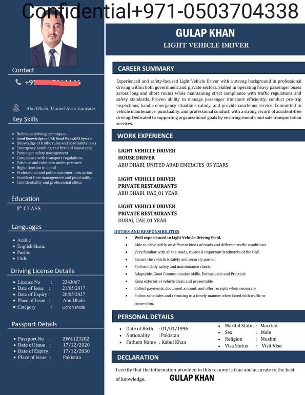 اسمي غولاب خان، ابحث عن وظيفة سائق مركبة خفيفة في الامارات العربية المتحدة. لدي خبرة 8 سنوات في الامارات