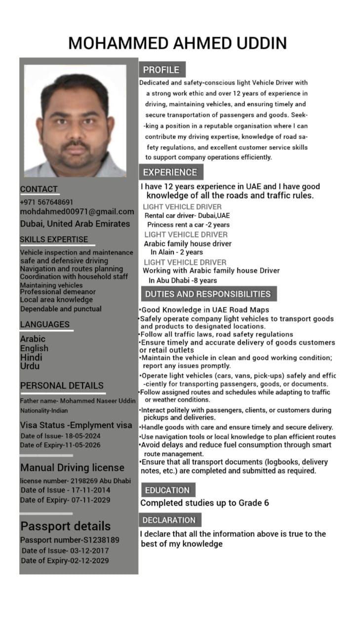 مرحبا، اسمي محمد أحمد، وأنا من حيدر آباد في الهند. ابحث عن وظيفة سائق، ولدي خبرة 12 عاما في مجال القيادة، وأحمل رخصة قيادة يدوية، وأعرف جيدا جميع طرق الامارات العربية المتحدة