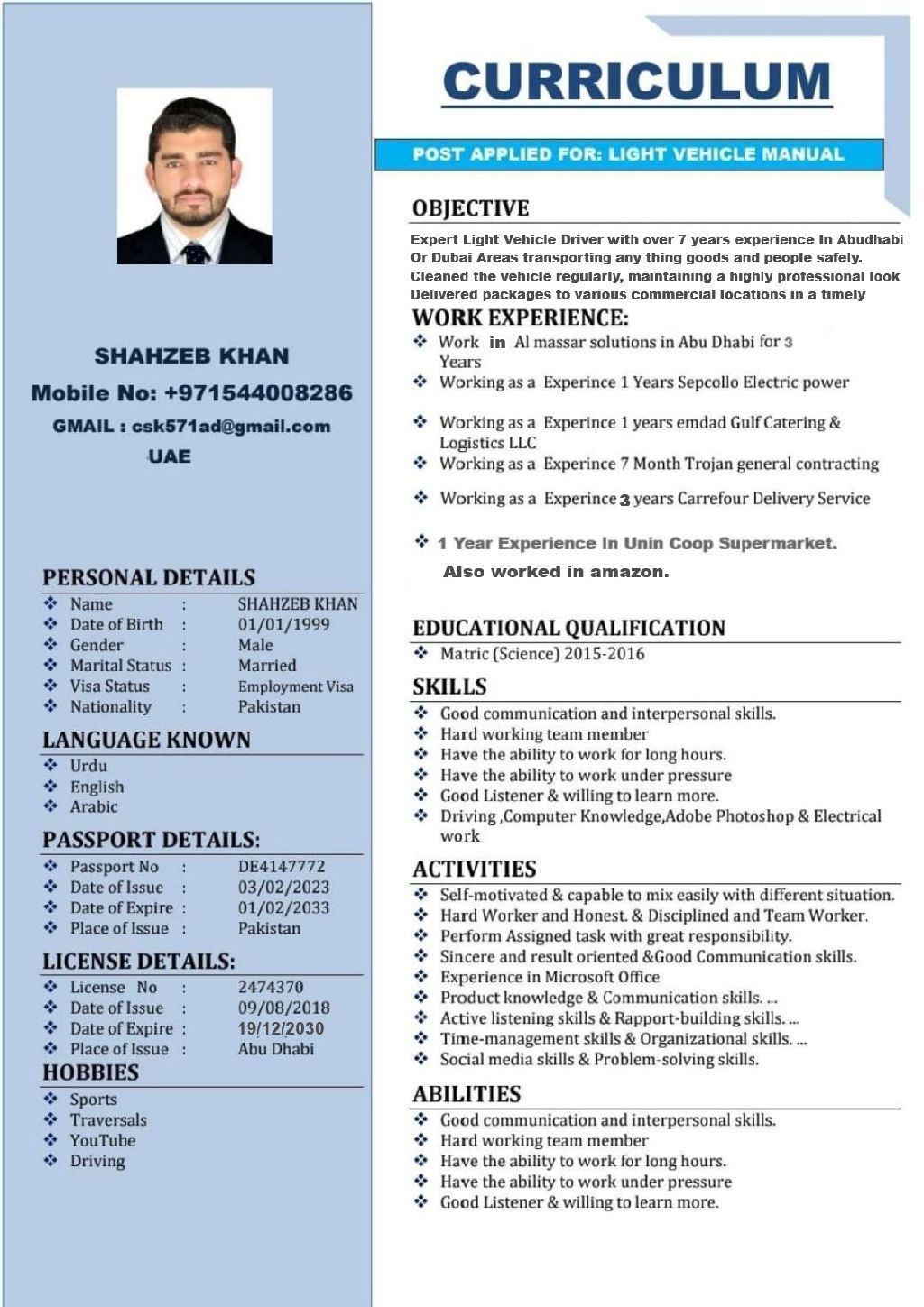 Expert Light Vehicle Driver with over 7 years experience In Abu Dhabi Or Dubai Areas transporting any thing goods and people safely. Cleaned the vehicle regularly, maintaining a highly professional look Delivered packages to various commercial locations in a timely manner Communication skill is good