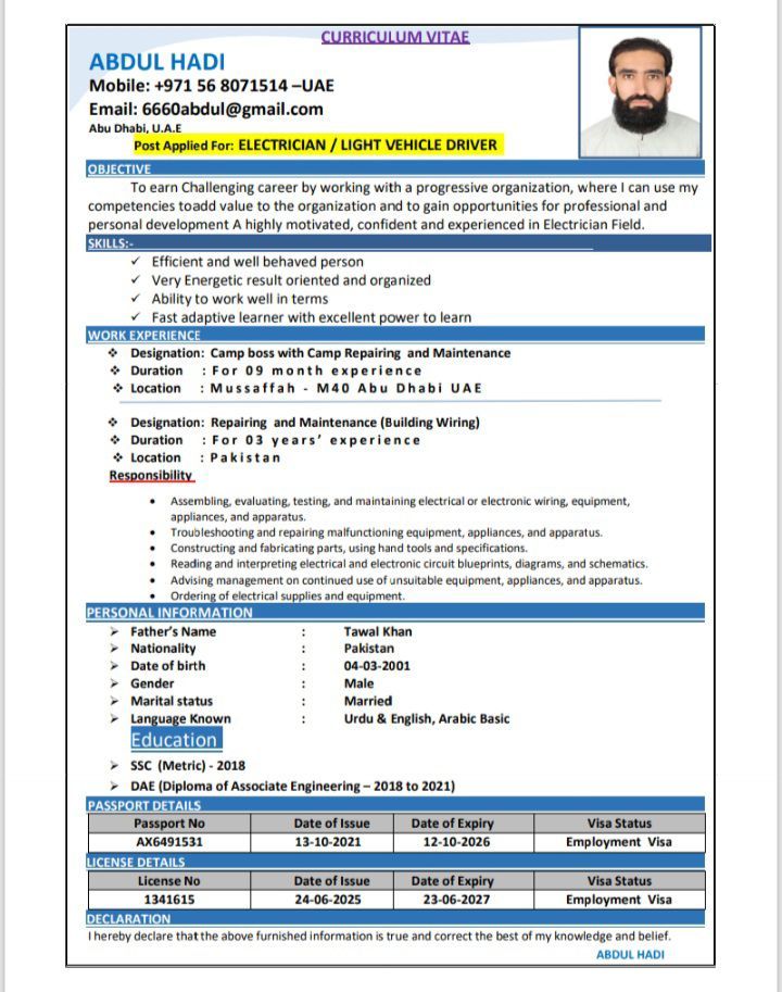 I am a driver light vical and electreshon I looking wark please help me and contact me