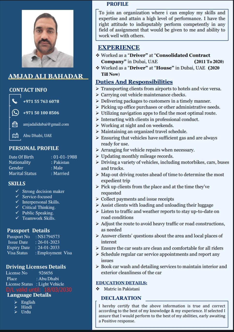 أنا امجد من باكستان عيش في امارات أبوظبي عندي رخصة خفيفه منوال أول شتغل بيت وشركة معلوم عربي انجليزي ومعلوم كلو مكان الحين موجود في أبوظبي 15 سنة في امارات