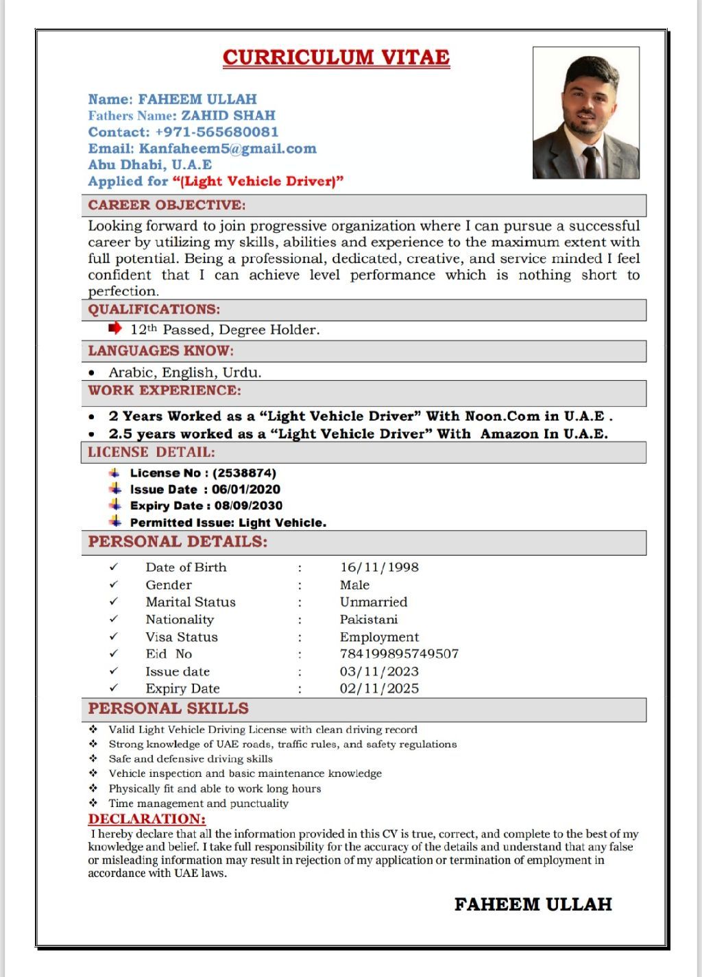 Looking for driver job. light vehicle license with 6 year exp. 2 year as a family driver. 2 year as a noon. com driver. 2 year as a company. 12th pass. I can speak English Arabic Urdu