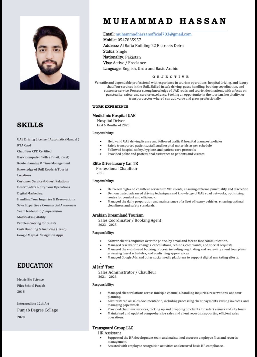 Experienced VIP Chauffeur Hospital Driver Tourism & Sales Professional Highly reliable and well - presented professional with proven experience in VIP chauffeur services, hospital driving, and tourism operations across the UAE. Holds a valid UAE driving license (Automatic & Manual) with strong knowledge of Dubai & UAE road networks, traffic regulations, and safety standards