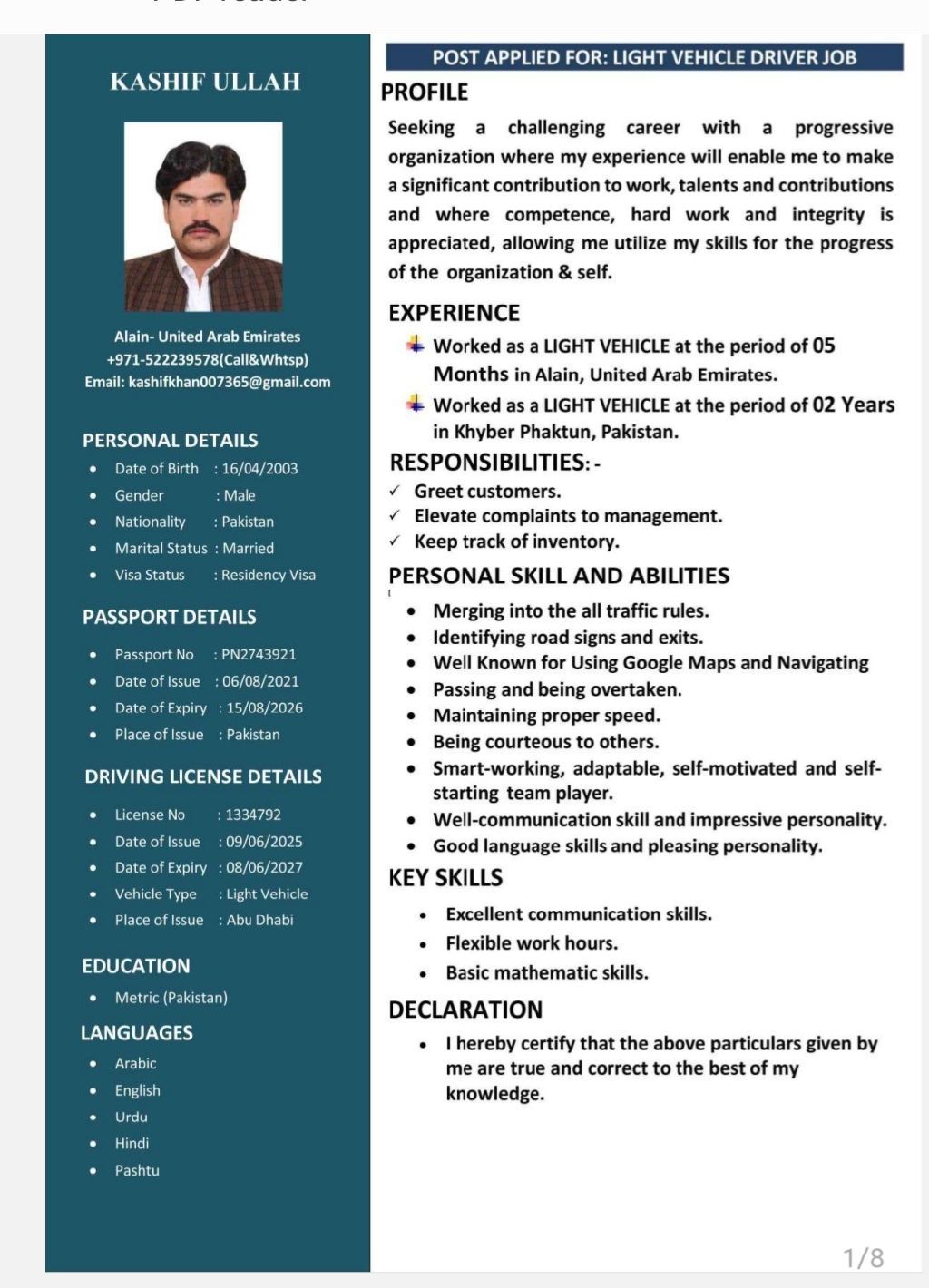 I need a job. I have a driver's license. I am from Pakistan. I have experience. I can speak Arabic and Urdu. I live in Al Ain