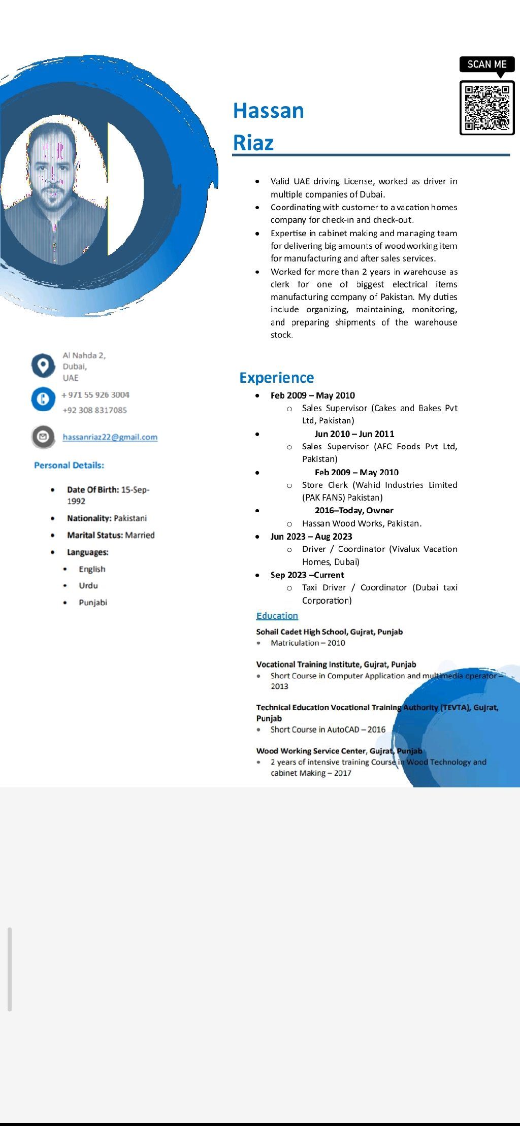 I am looking for driver Job, I have 3 + years driving experience in Dubai Taxi Corporation, I have little bit experience in maintenance, 12 years wood working experience in Pakistan, 3 years experience as a store clerk in Pakistani, also have experience in vacation/ Holiday Homes