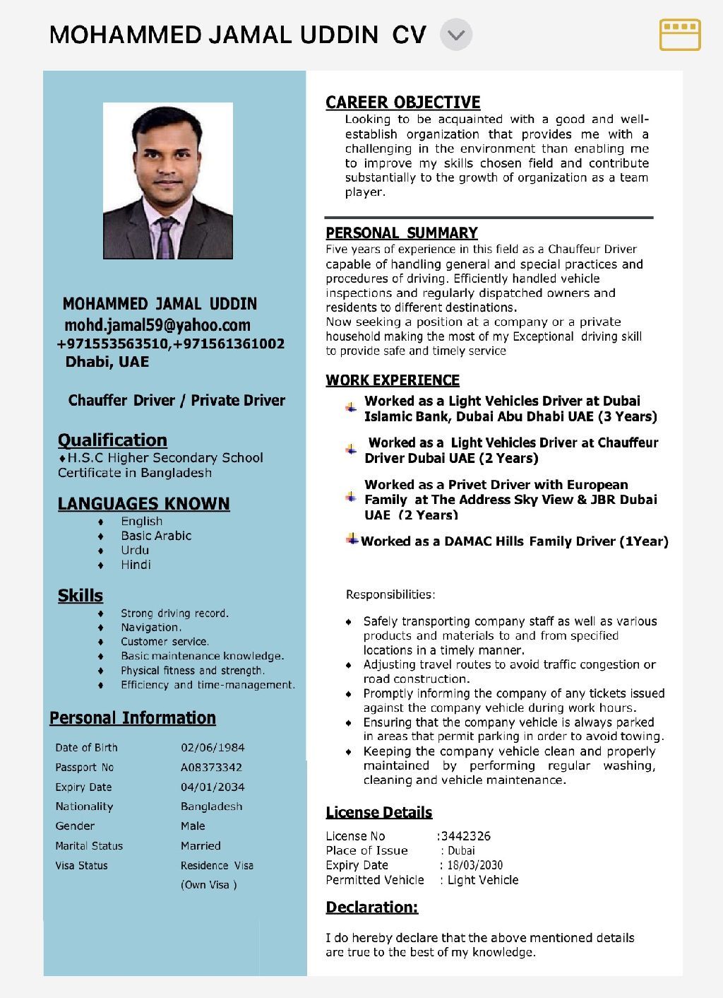 Well experience driver looking for driver jobs, I am 37y old, 10y experience in driving more information please check my resume
