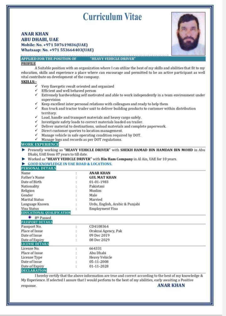 Hello sir I need job of heavy truck driver I have experience 10 years bin Ham company and 6 years shekh Hamad bin Hamad in Abu Dhabi please check my CV
