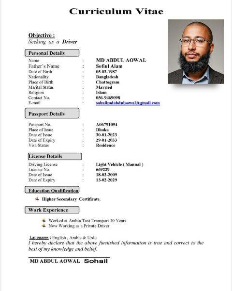 Hello, are you looking for an honest, loyal and trustworthy driver Then Im SOHAIL Mohammed here Seeking job as a driver. Im Educated well trained and professional luxury car driver with Own employment visa. 17 years of experience in UAE, I have been worked in taxi company for 10 years. Also have primary car maintenance experience. Please contact me if you need. Thanks