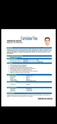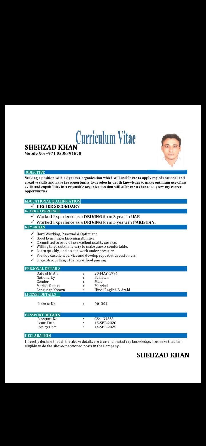 My name is Shehzad Khan I am from Pakistan. I have light vehicle driving license. experience 4 years all UAE