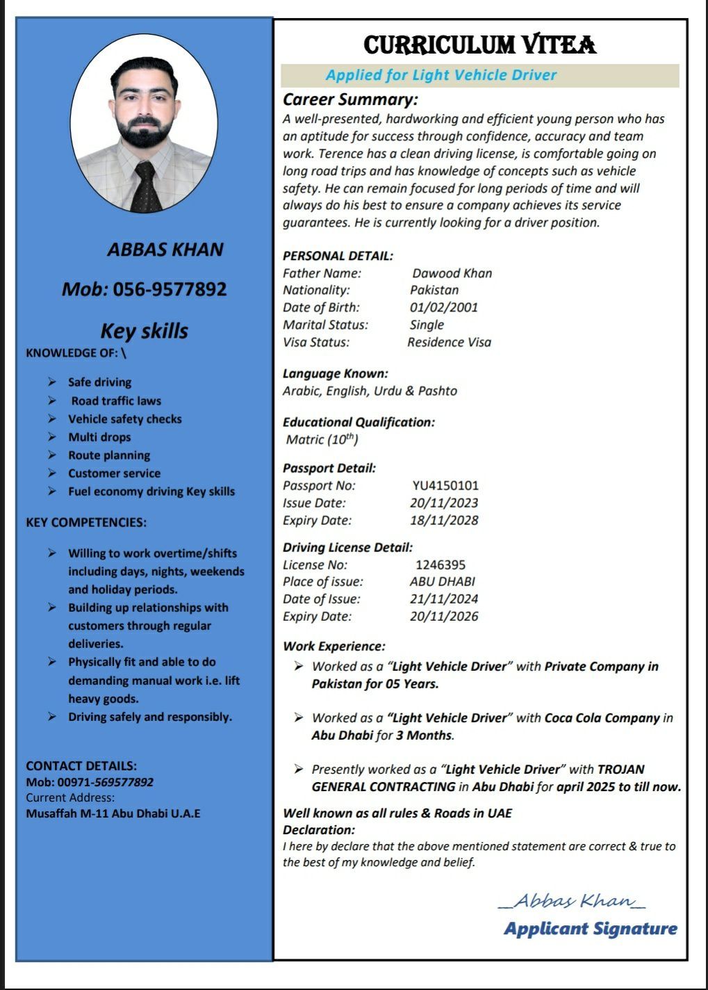 My name is Abbas Khan I am from Pakistan I have good qualifications have strong skills also DIT diploma I have light vehicle driving license in UAE I have 2 years freelancing visa if you have any suitable job for me then let me know I'll be grateful to you your small help can turn my career