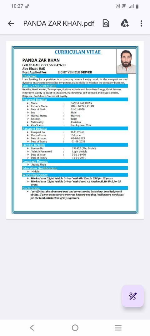 I am Pandazar Khan from Pakistan 55 year old I have Lights Vehicle license my experience in Abu Dhabi 27 year I have own visa I looking for a job