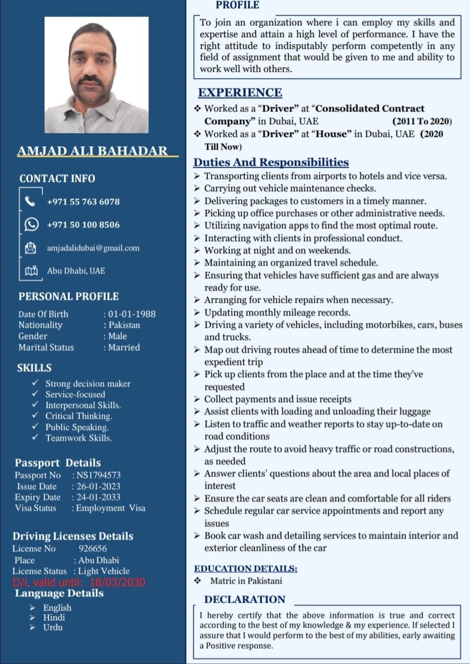 I am Amjad from pakistan in Abu Dhabi before work company and house I speak Urdu English Arabic 13 years experience UAE I have Light driving license naw Abu Dhabi tinhks
