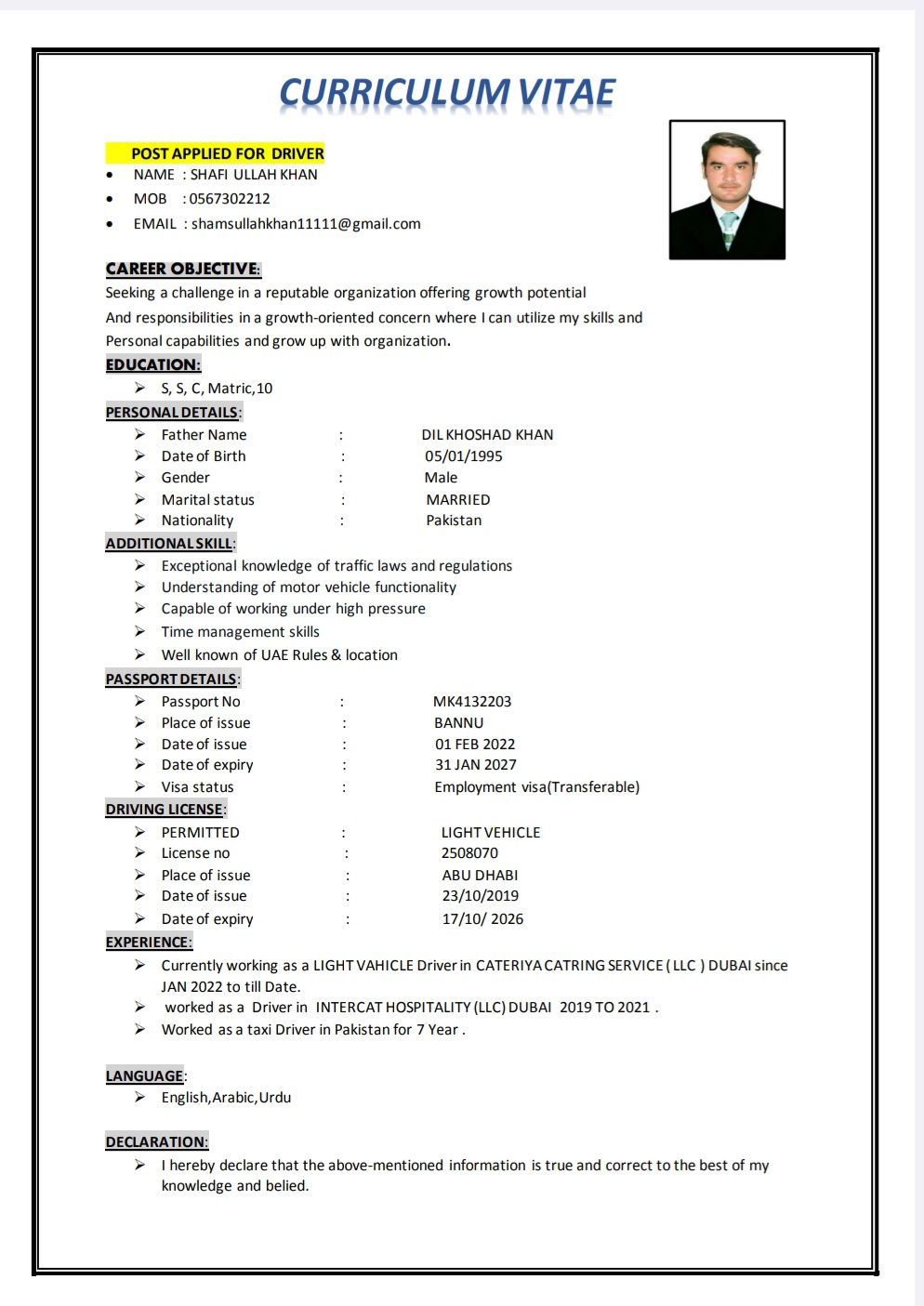 Light Vehicle Driver - 5 Years of Experience Experienced and responsible Light Vehicle Driver with over 5 years of proven expertise in safe and efficient transportation across the UAE. Skilled in navigating city routes, following traffic regulations, and ensuring timely delivery of passengers and goods. Strong knowledge of vehicle maintenance, route planning, and customer service. Capable of work