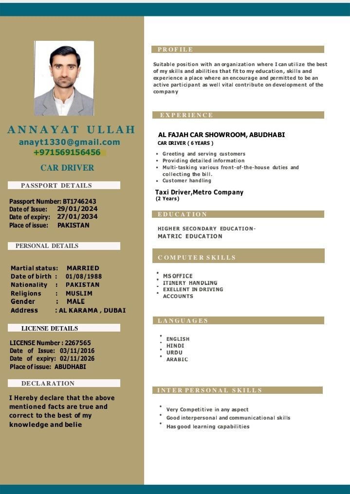 I am a professional driver with 8 years of experience in the UAE, skilled in safe driving, route planning, and customer service. Fluent in English, Arabic, Urdu, and Hindi