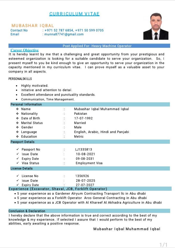 My name is Mubashar iqbal. Am live in Abu Dhabi. I have operater license 8No. I have khno experience JCB, forklift, Excavator, Shawel. Already I work in company as JCP operater. I search job my best futture. Thanks