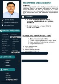Experience Total 13 years/ Worked as a 5 Years Driver in Pran Company. Abu Dhabi. Al Ain. Ajman. Sharjah 8 years Working House Driving Abu Dhabi. Al Ain Date of Birth 01011980 Nationality Bangladesh Religion Islam Marital Status Single Gender Male Visa Status Employment Licenses Manuel Languages English/ Hindi/ Arabic - language Education Class Nine