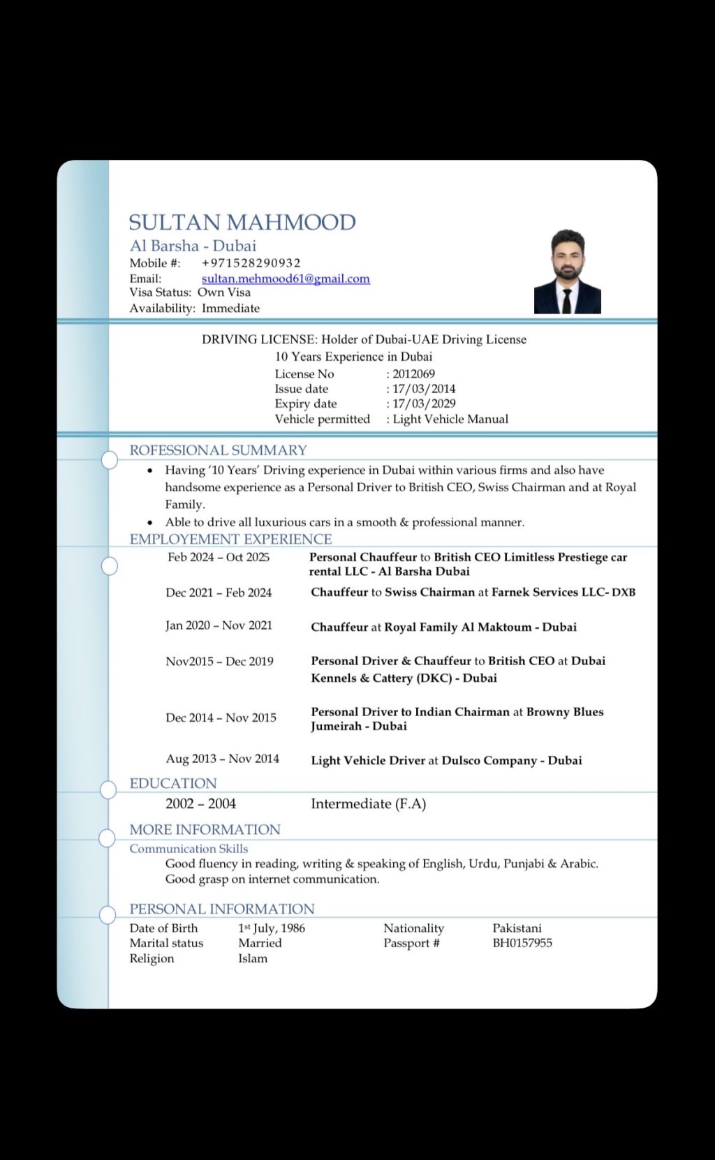 Own Visa available immeditely having 10 years driving experience as a personal Chauffeur Driver