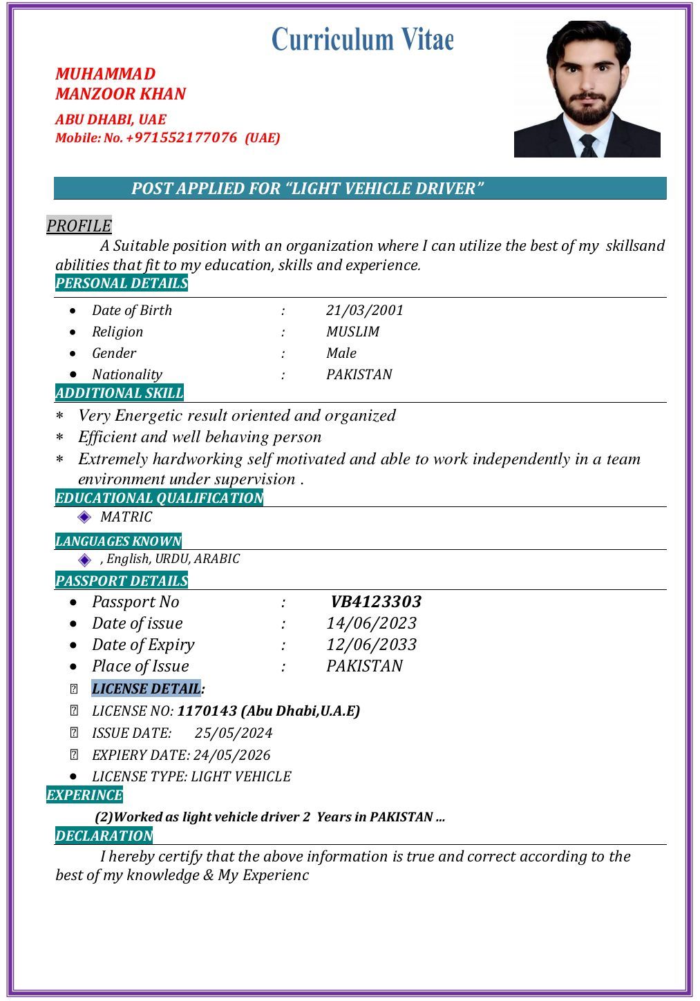 My Name Manzoor khan I am form Pakistani Need driver job light vehicle driver I know All UAE Location my contact Nambur