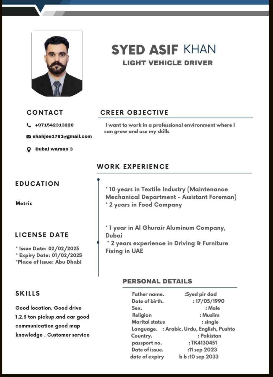 My name is Syed Asif khan I have 3 no license I have 2 Year experience I am looking a driver job I am in Dubai in visit visa