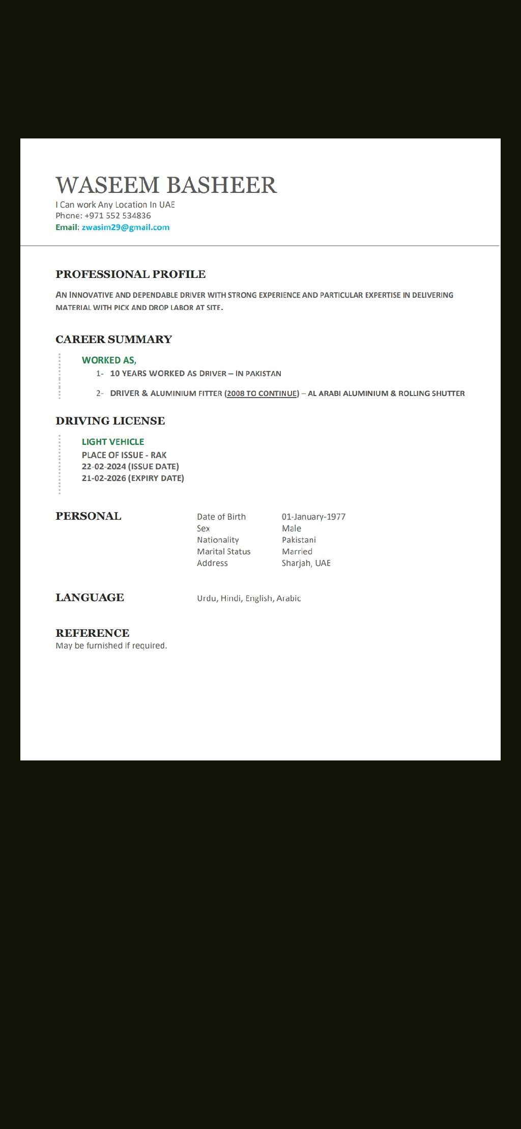I am work 19 year in UAE and driving in 1 year 9 month al arabi aluminum company in Sharjah