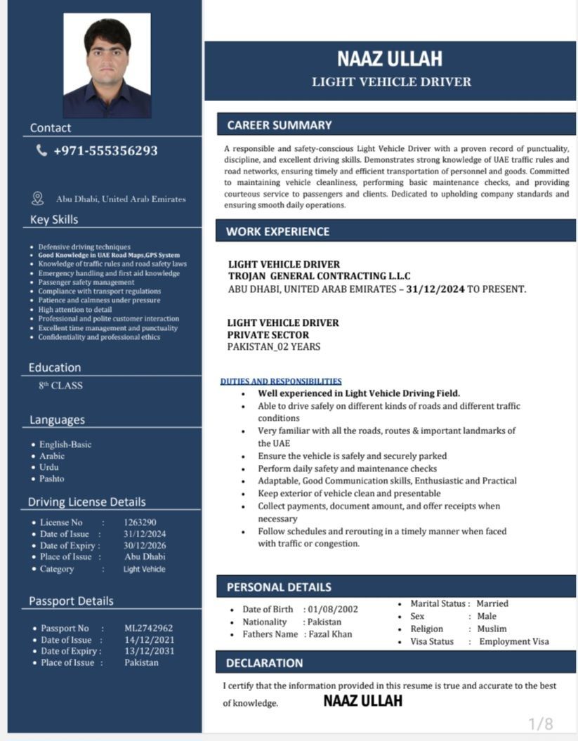 My name is Naazullah I am from Pakistan I have a light vehicle license. I have beast experience in Abu Dhabi I have 1 year experience in Trojan NPC I am looking for jobs any company and all time ready. Thanks