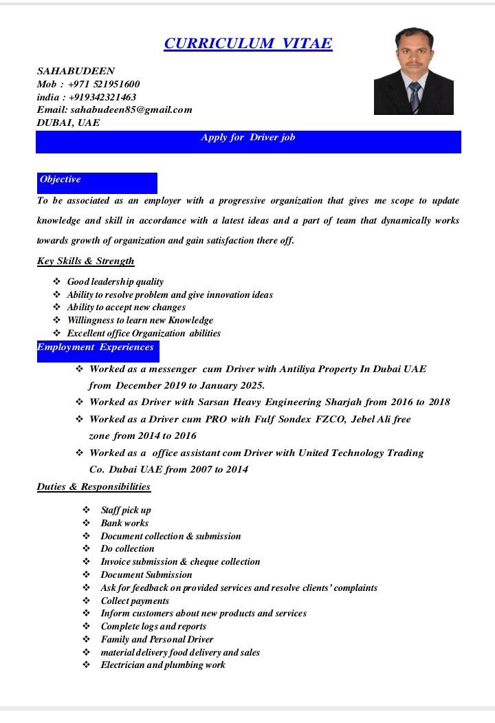 Dear sir madam I am looking for driver job I am from Indian national and tamil my name, Sahabudeen my visa cancelled visa I have UAE driving license for light vehicle driver manual & automatic 12 year experience in UAE all location GPS MAP I know