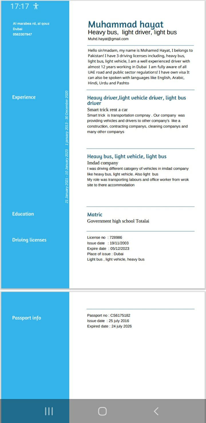 Hello sir I am from Pakistan I am living in Dubai Al Quoz I have three license small vehicle mini bus heavy bus 12 years experience in Dubai I have own visa contact