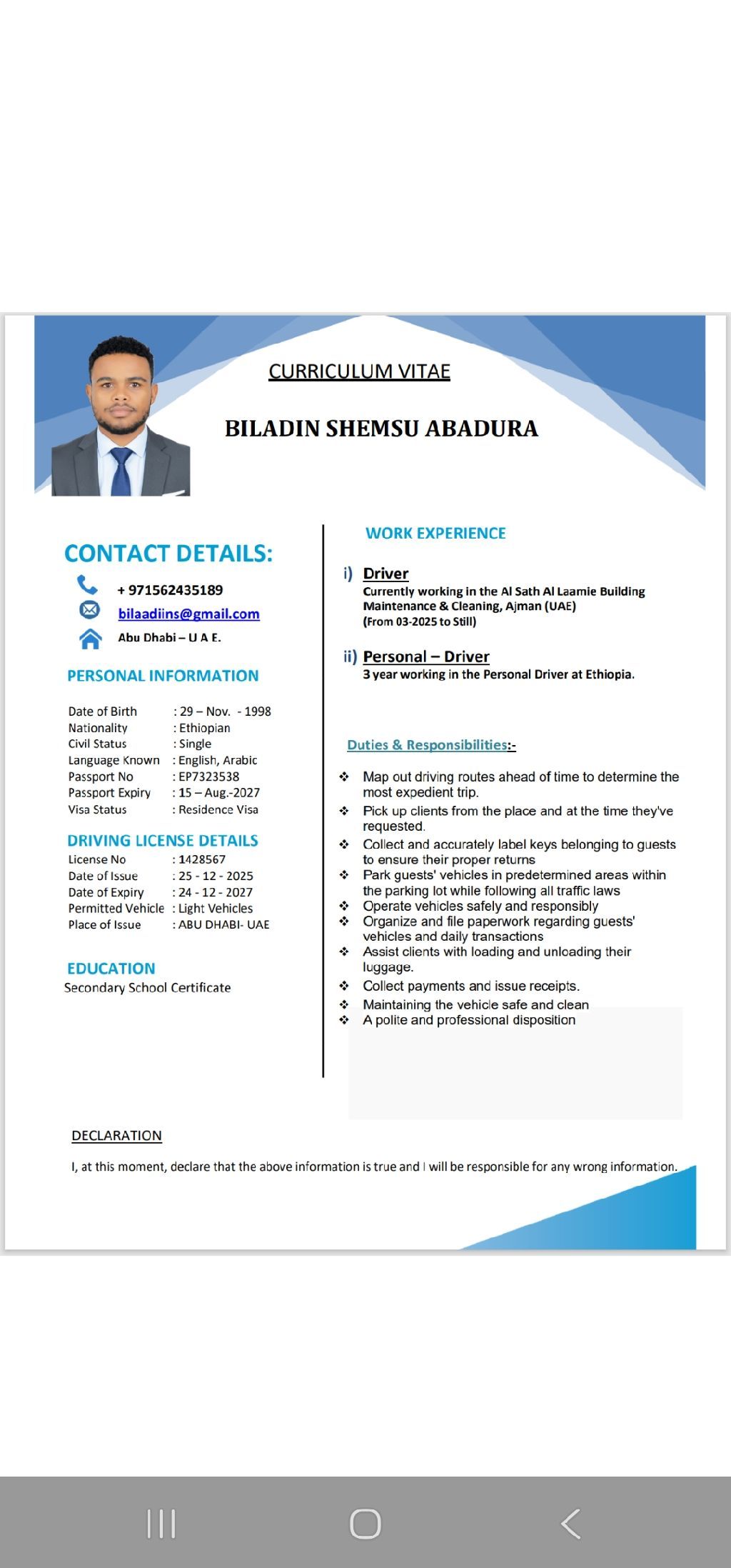 I am from Ethiopia I have experience my country east African Ethiopia 3 years but I am new UAE I have light vehicle license please you need me call me