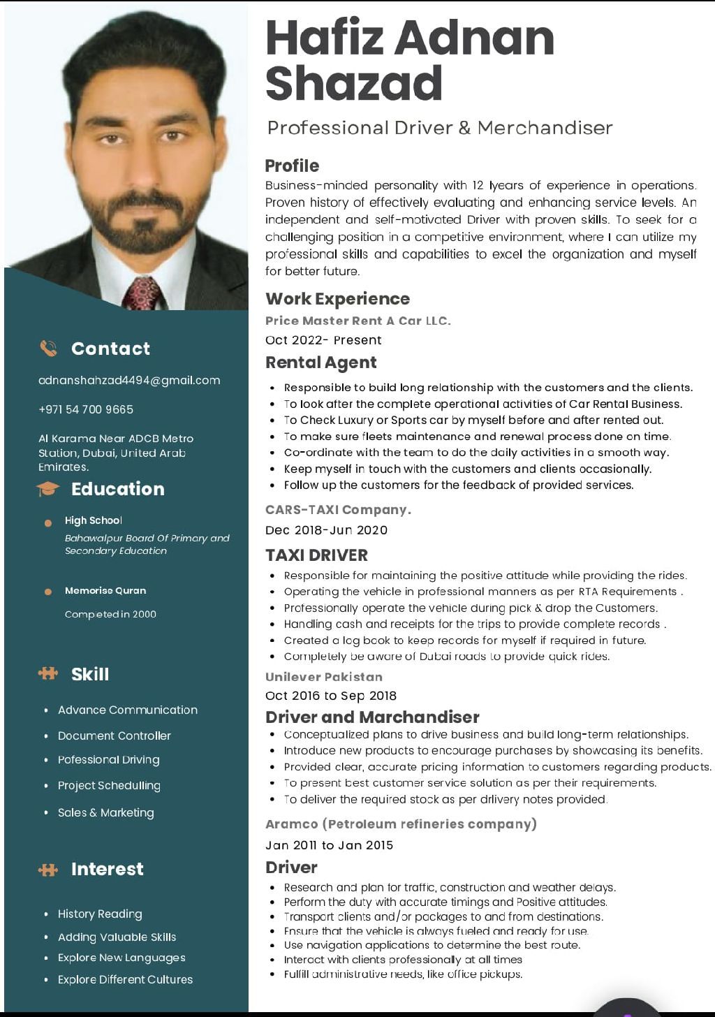 My name hafiz Adnan shahzad I am looking a job light vehicle driver I have good experience 7 years yae and 5 years experience kSA