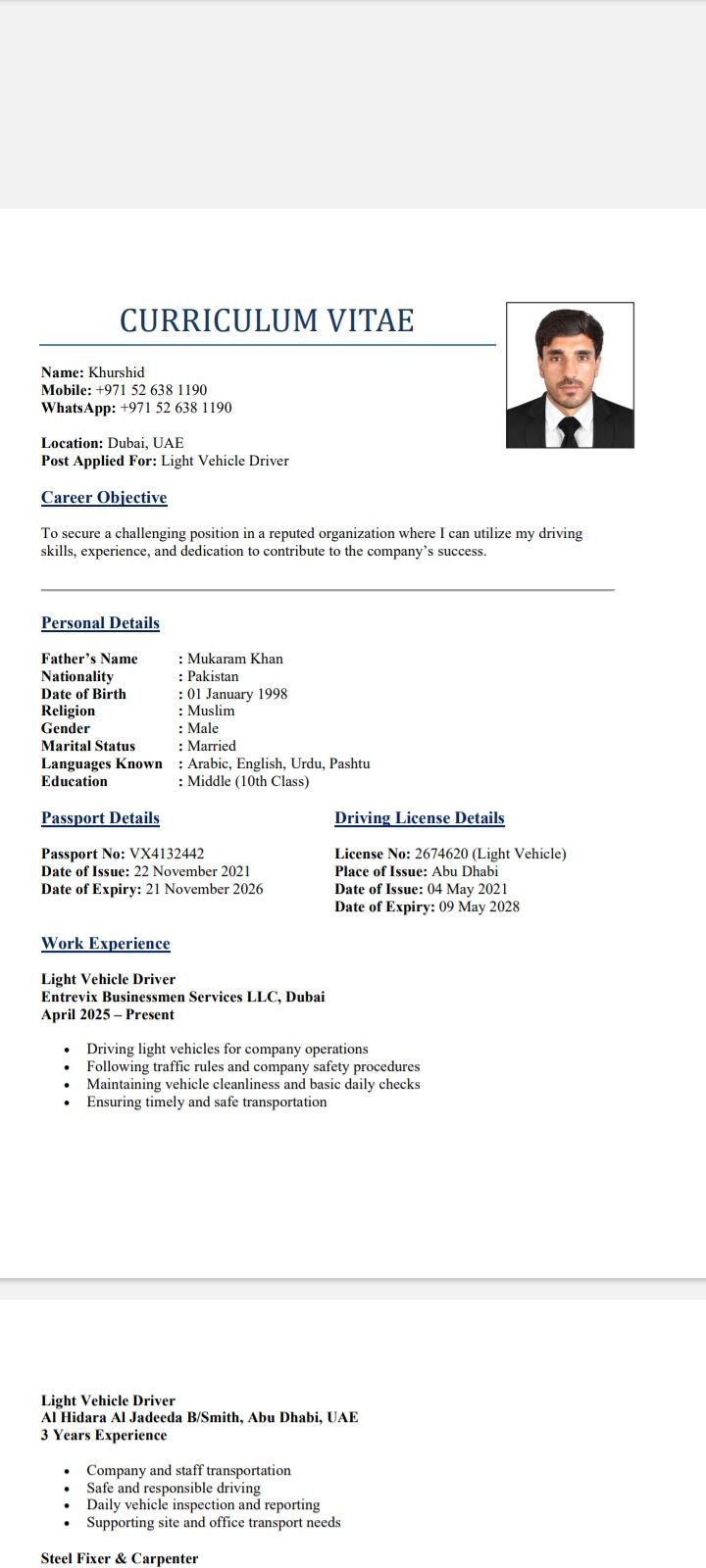 I am light vehicle driver if anyone need contact with me I have 5 Year old license I am live in Dubai I know location all English Arabic Urdu Pashto