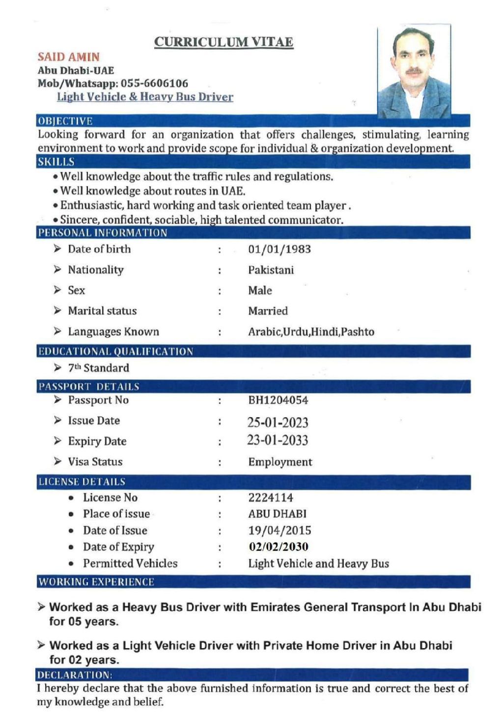 My name said Amin national ID Pakistan UAE job light vehicle heavy bus. experience 12 year