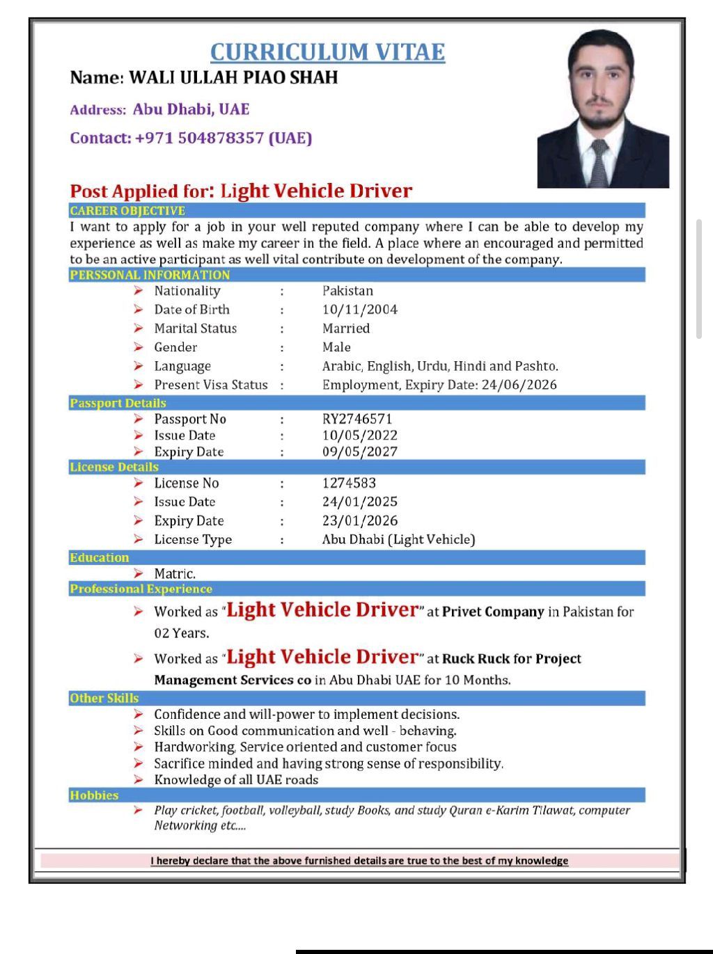 HI DEAR MY NAME IS WALI ULLAH From PAKISTAN AND I have Light VICHEL Driving License AND I Know UAE ROAD Very WELL I have Own Visa I have 4 FOUR MONTHS IN MY Visa