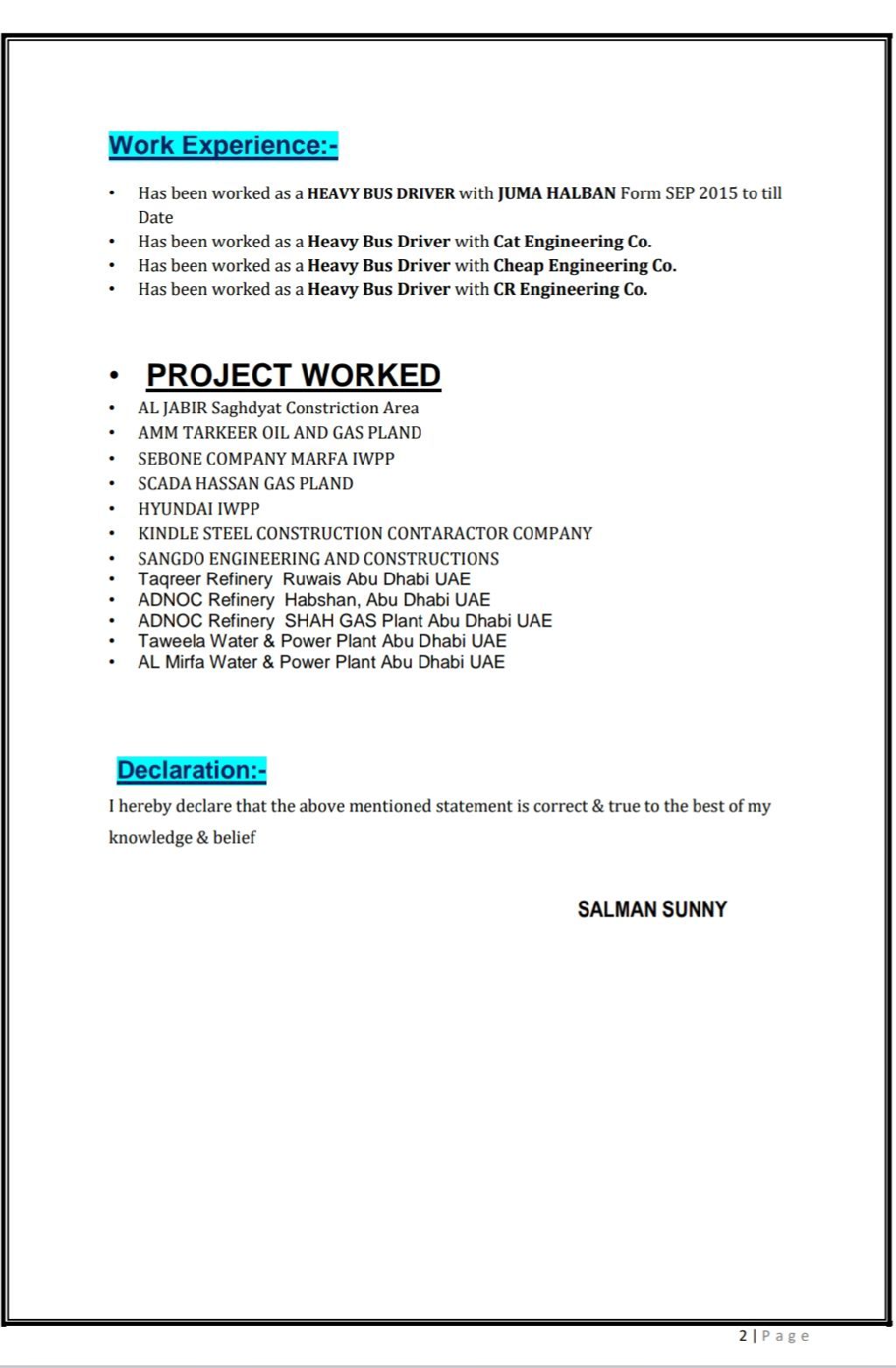 My name is Salman I am applying for bus driver job in UAE I have 11 year experience in Abu Dhabi oil field Submitted my CV bellow