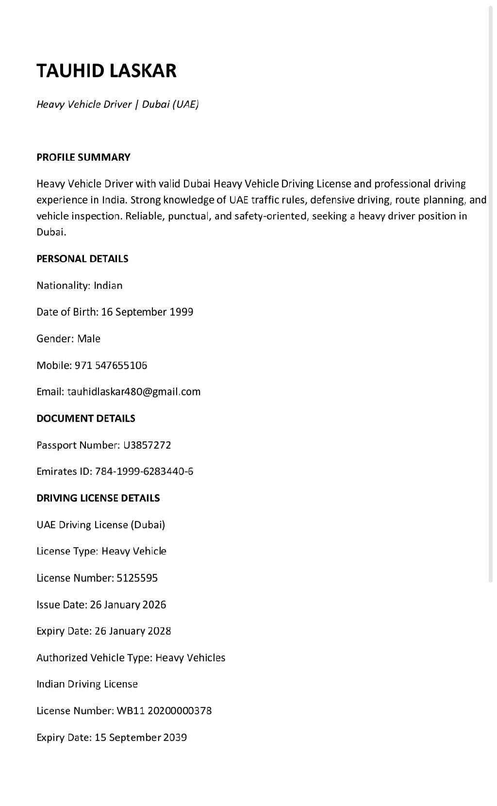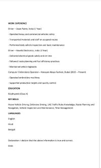 Motivated and responsible Heavy Vehicle Driver with a valid UAE Heavy Driving License, seeking an opportunity to start a professional driving career in Dubai. Knowledgeable about road safety rules, UAE traffic regulations, vehicle inspection, and safe transportation practices. Able to drive heavy vehicles with care, discipline, and attention to safety. Strong willingness to learn, work flexible h