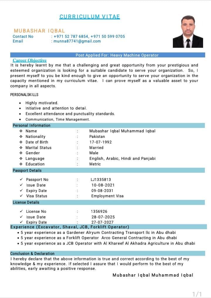 My name is mubashar Iqbal I live in UAE I have heavy machinery license already my current company work as a operator I am looking for my best future if you need anyone please contact me I have experience operate JCB forklift shawal excavator pc400 thanks