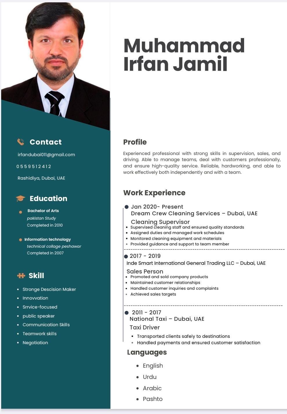 My name is Muhammad Irfan from Pakistan I am working in united Arab Emirates since 2010 I have good knowledge of Dubai roads and very good experience 6 Years experience national taxi in Dubai