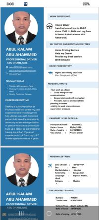 My name is abul kalam I am from Bangladesh I am looking for driving job I have 15 years of experience Abu Dhabi UAE language English & arabik Madam sir I need a job pleaseMadam sir I need a job please