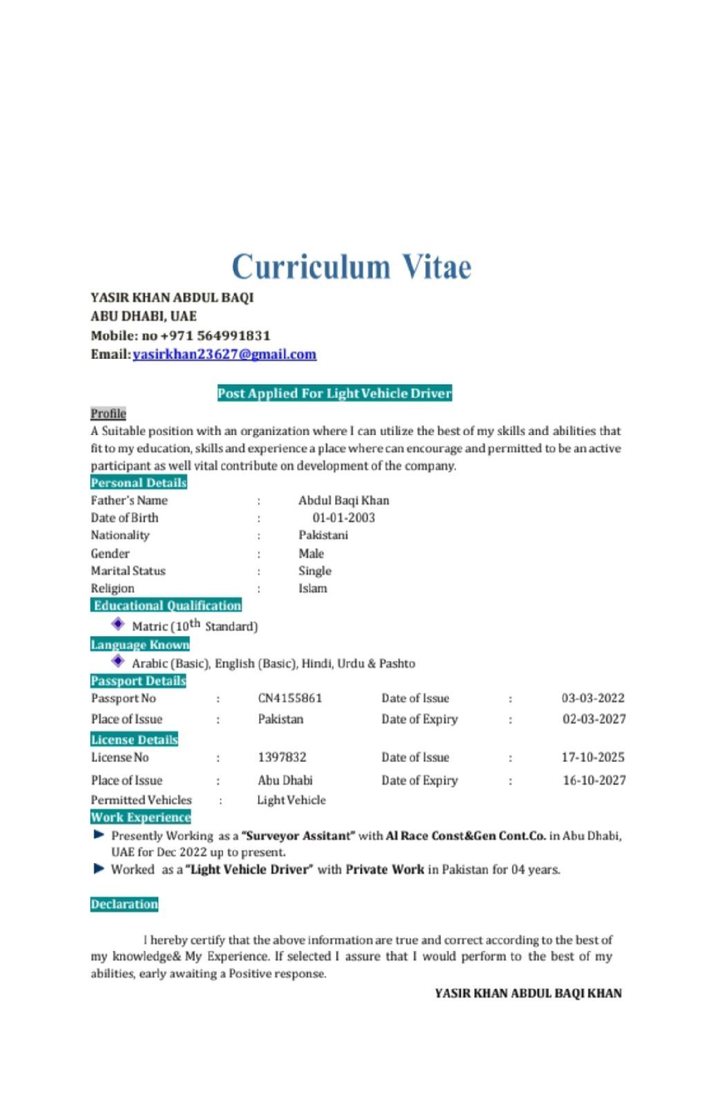 My name is Yasir Khan from Pakistan. I have 3 number manual driving license. I have 7 months experience in UAE. in Pakistan 3 years experience. I am looking for the driving job