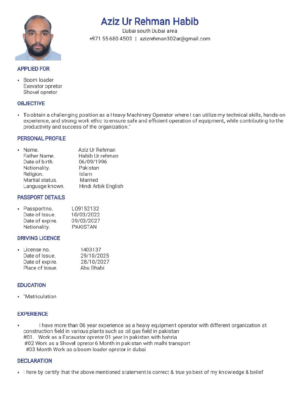 E I have more than 06 year experience as a heavy equipment operator with different organization at construction field in various plants such as oil gas field in pakistan. Work as a Excavator operator 01 year in pakistan with bahria Work as a Shovel operator 6 Month in pakistan with malhi transport Month Work as a boom loader operator in Dubai